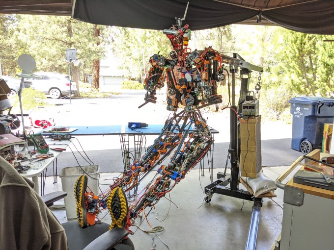 En effet, à l'extrémité, le sommet d'une tête de robot est à peine visible, regardant par-dessus l'épaule de Kohstall alors qu'il se connecte à la réunion. Je demande si le système monté au plafond est utilisé pour tester le robot bipède de son système. Il répond par l'affirmative, avant d'ajouter que l'équipe est passée à un autre système, moins conventionnel : un porte-manteau à 80 $.