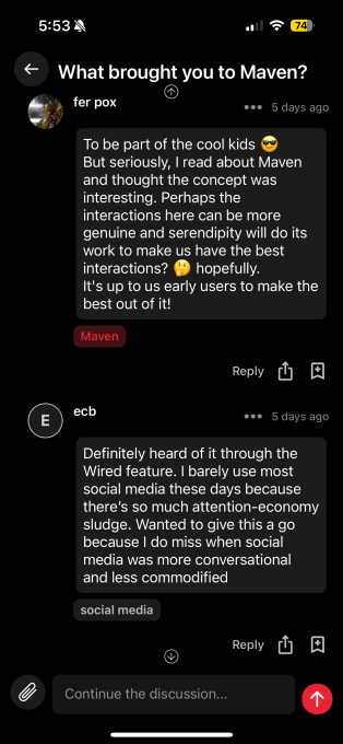 Et en effet, l'espoir idéaliste de Maven de connecter les gens à des idées intéressantes est une bouffée d'air frais qui sent bon le début des années 2000, quand Internet était un lieu de connexion et d'exploration. Les sentiments des premiers utilisateurs de la plateforme sont pour la plupart positifs et optimistes, car beaucoup sont venus sur la plateforme pour des interactions authentiques et fortuites et pour l'absence promise de toxicité.