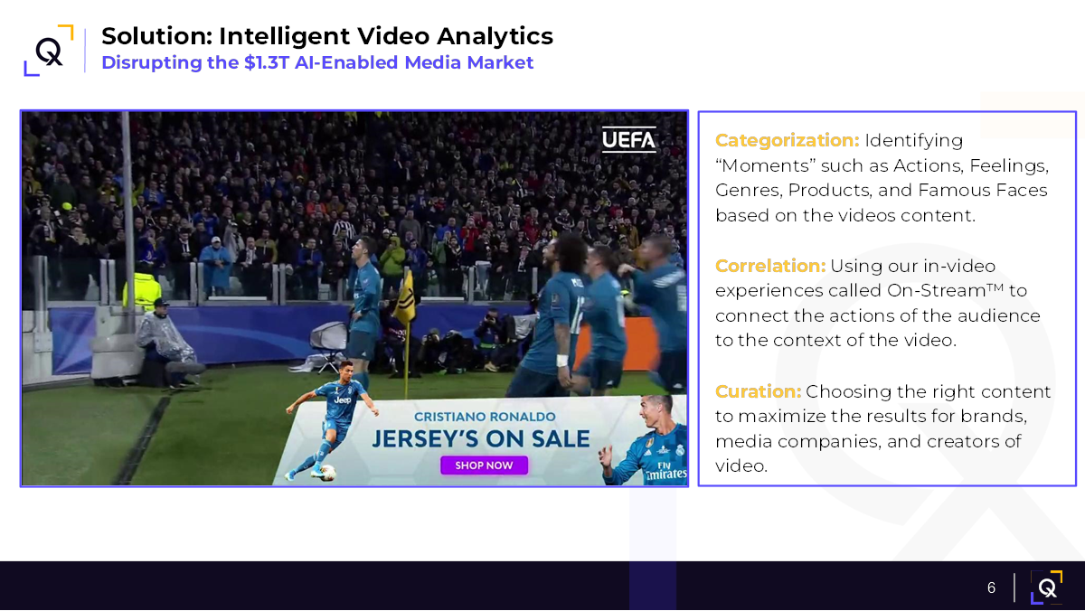 La diapositive 6 présente une vidéo offrant un aperçu en temps réel de la façon dont l’entreprise discerne l’engagement du public et adapte ses stratégies marketing en conséquence. La diapositive 7 fait monter la barre avec une autre vidéo, illustrant cette fois l’intégration transparente des publicités dans l’expérience utilisateur. Et la diapositive 12 présente une autre vidéo renforçant l’engagement de Qortex à révolutionner l’intersection de la technologie et du marketing.