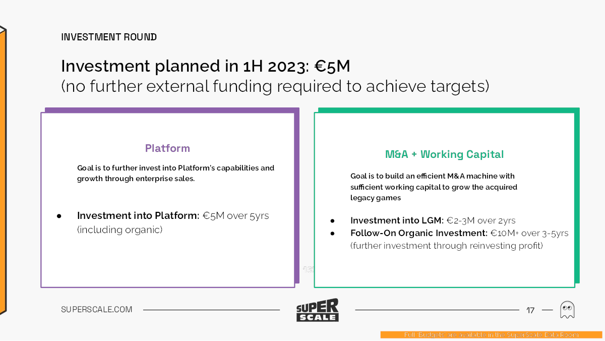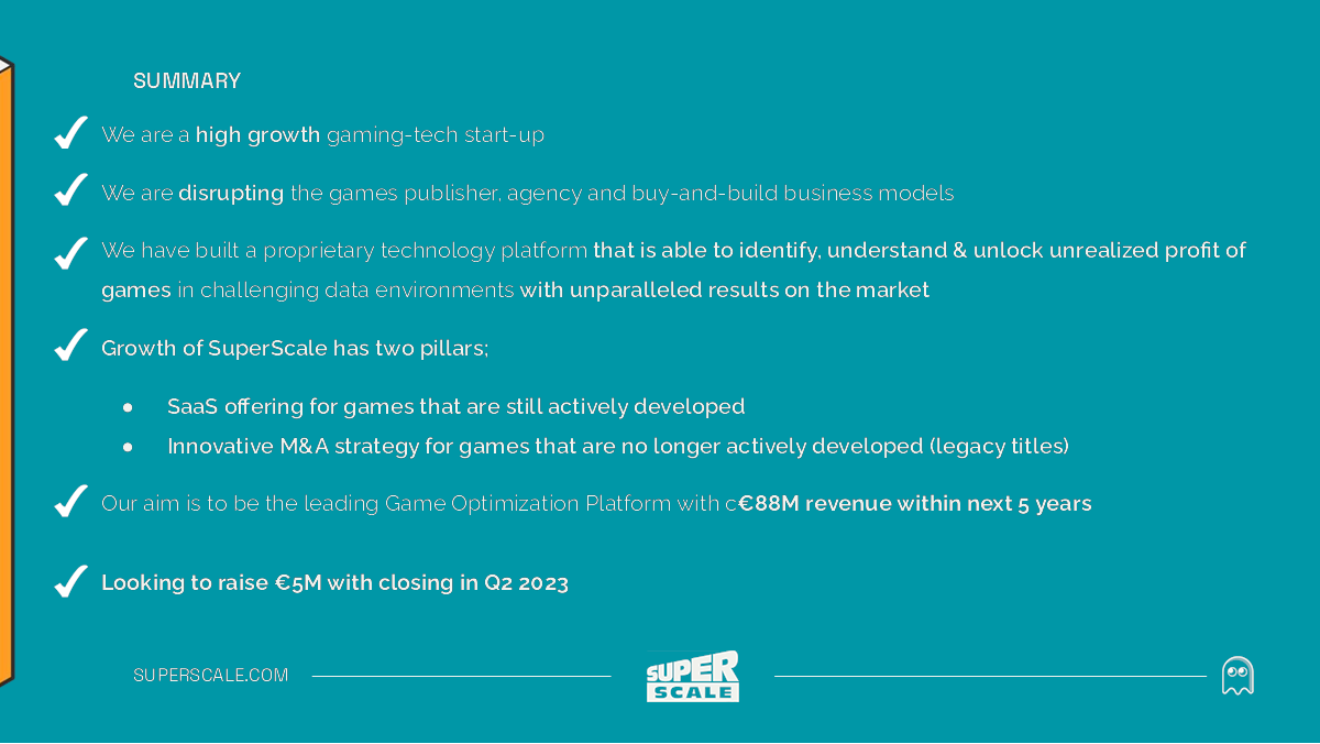 Le jeu est un marché énorme et les investisseurs n’ont pas besoin d’en être convaincus. La question est alors de savoir comment obtenir une part de ce délicieux gâteau numérique. SuperScale fait ici quelques actes de foi intéressants : les chiffres sont des projections pour 2027, plutôt que de parler des chiffres d’aujourd’hui. Mais cette diapositive arrive au début du exposé ; Si SuperScale peut présenter un argument solide sur la façon dont il fera partie de la machine qui fera croître le jeu de 10 %, c'est vraiment très intéressant.