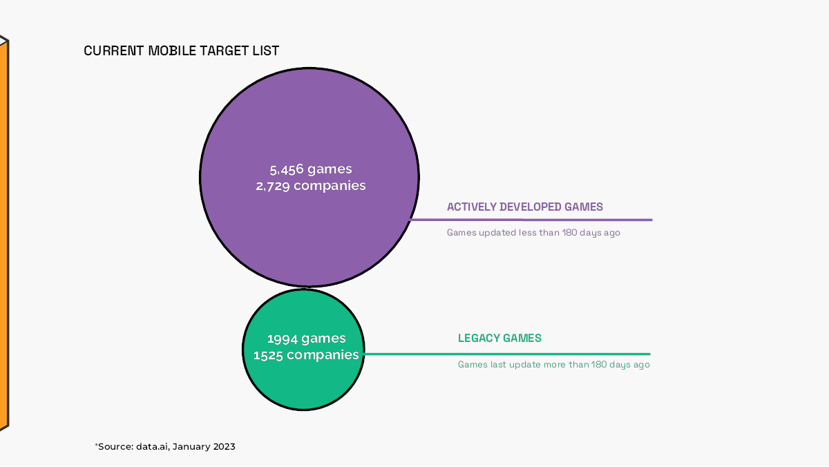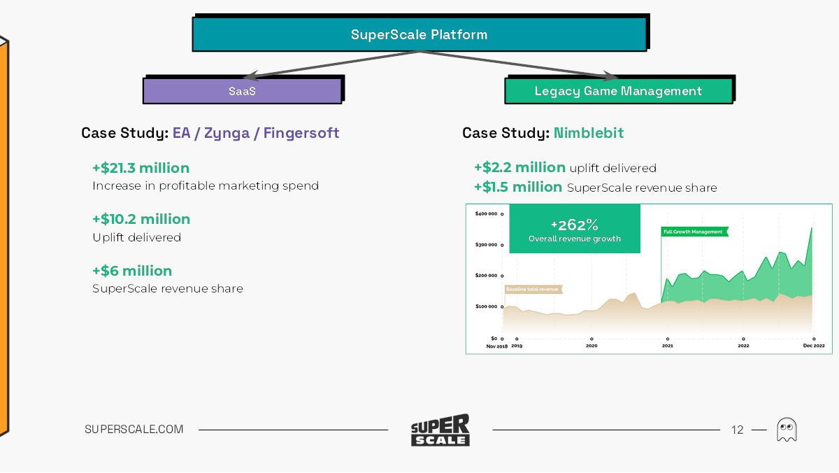 En tant que société d'optimisation de jeux, SuperScale a une approche intéressante, et cette simple diapositive contient une promesse intelligente : et si nous pouvions augmenter massivement la rentabilité d'un jeu déjà disponible ? Le modèle de SuperScale vise, en partie, à donner à ces jeux une nouvelle vie à une étape du cycle de publication des jeux où chaque dollar entrant est fondamentalement un bonus. Le deck n'en fait pas grand chose, mais je peux voir qu'il s'agit d'une technique de vente très puissante pour les studios de jeux – et si elle réussit avec les jeux existants (sans risque), ne serait-il pas intelligent d'intégrer SuperScale sur les nouveaux jeux aussi ?