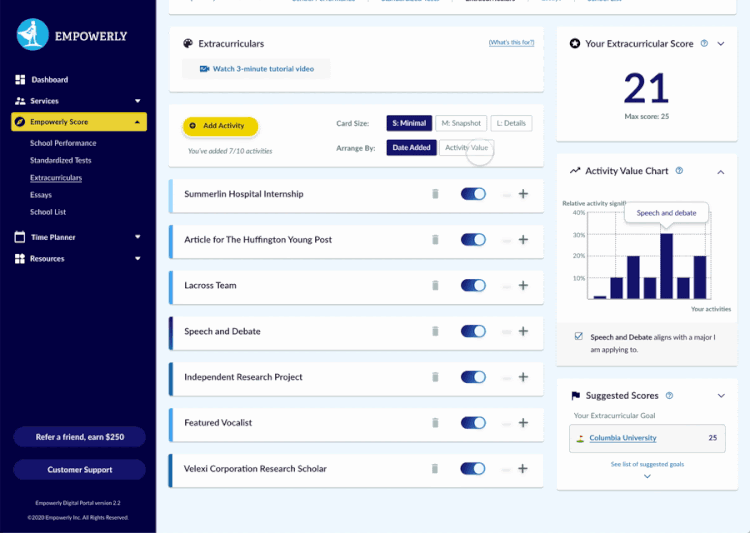 Empowerly présente sa technologie exclusive – The Empowerly Score – comme le principal différenciateur entre ses concurrents, parmi lesquels CollegeWise, Solomon Admission Consulting et AcceptU. Le score Empowerly évalue les activités parascolaires d’un élève (sports, services communautaires et clubs), ses réalisations (prix et rôles de leadership), ses études et ses dissertations, puis exploite des modèles d’apprentissage automatique prédictifs pour générer un score unique, mettant en évidence les domaines dans lesquels les étudiants devraient améliorer pour mieux rivaliser avec les autres candidats.