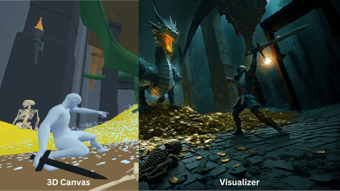 Après la phase de conception initiale, les utilisateurs peuvent passer en «mode Visualizer», qui utilise la génération d'images AI pour rendre la scène plus vivement. Intangible exploite la diffusion en profondeur, le lama et la diffusion stable, entre autres.