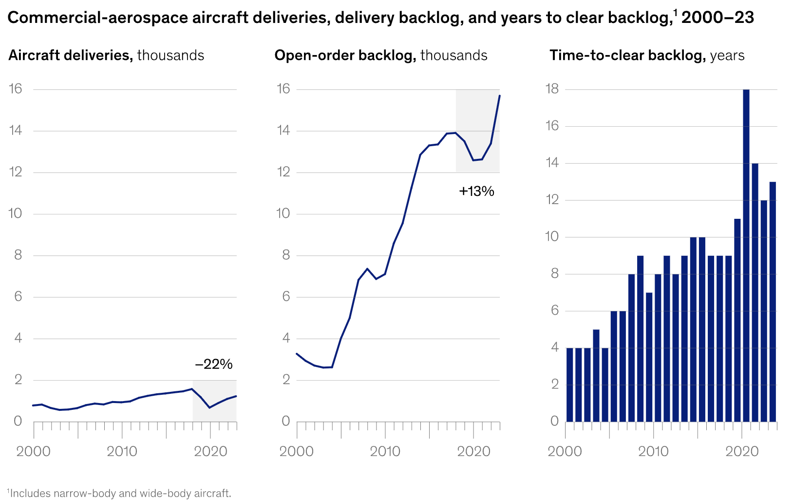 Le rebond a incité les compagnies aériennes à étendre les flottes, poussant les commandes même si l'industrie est aux prises avec des goulets d'étranglement de talents et de production, comme le note Deloitte dans un récent rapport. Les fournisseurs de niveau 1 sont confrontés à des délais prolongés alors que l'arriéré d'avion commercial atteint un record de près de 15 700 unités, selon McKinsey.