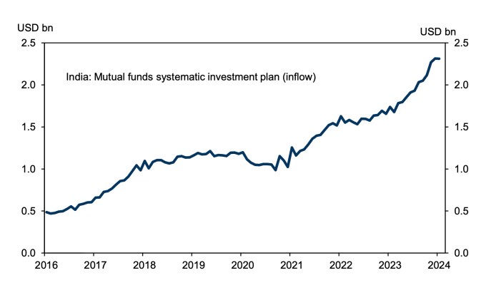 L’Inde connaît également une forte financiarisation de son économie, avec une croissance significative observée dans des secteurs comme l’assurance et les fonds communs de placement. Le nombre de comptes de fonds communs de placement a été multiplié par 3,5 depuis 2015, avec des gains exponentiels dans les comptes systématiques de faible taille au cours des trois dernières années, selon Macquarie.