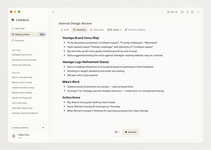 « Nous avons commencé quand Alap a posé un problème intéressant selon lequel l'IA concernerait votre [users’] données. Les modèles ne savent rien de vous, ce qui limite leur utilité. Nous réfléchissions à divers paradigmes d’interface utilisateur et de système d’exploitation qui étaient susceptibles d’être perturbés par l’IA et qui ont lancé Littlebird en tant que projet », a déclaré Green à TechCrunch lors d’un appel.