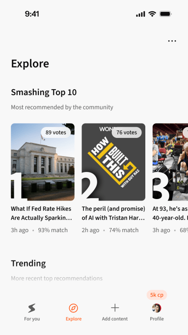Construite au cours de l'année dernière, à la suite d'un cycle de démarrage, l'application iOS de Smashing permet aux utilisateurs de suivre leurs intérêts d'une manière qui rappelle une autre application d'actualités sur l'IA, Artifact, mais avec une orientation plus large. Les utilisateurs peuvent soumettre leur propre contenu et approuver les recommandations de l'application basées sur l'IA concernant le contenu partagé par d'autres et regroupé à partir du Web. Cependant, cela ne se limite pas aux actualités : tout ce qui comporte une URL peut être soumis.