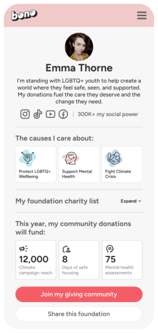 Pour garder les utilisateurs engagés et informés, Bono fournit un rapport d'impact hebdomadaire, détaillant comment et où leurs dons font la différence. Par exemple, cela montre combien de repas ou de séances de santé mentale leurs dons ont payé. Il existe également une application mobile (disponible sur iOS et Android Appareils) pour voir leur impact annuel.